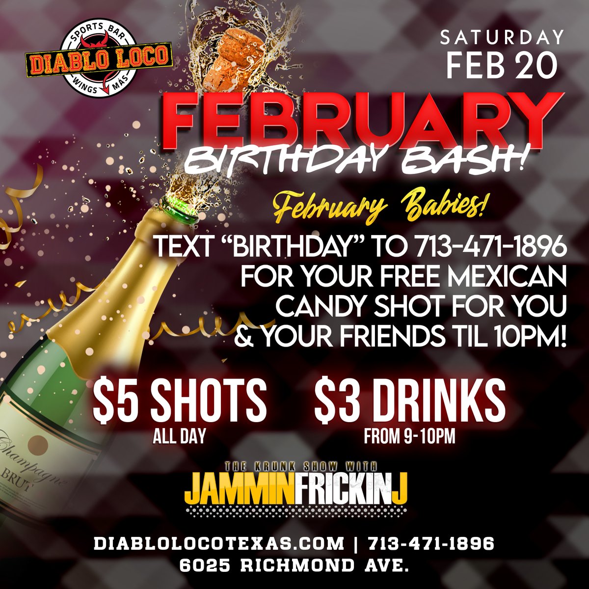 Also featuring Houstons Best. Diablo Loco Sports Bar 6025 Richmond Ave Houston TX 77057 This Richmond Avenue bar will celebrate the Super Bowl with 6 Crown Royal cocktails all day long plus plenty of spicy boiled crawfish to snack on during the game. Their telephone number is 1 713-266-4244.