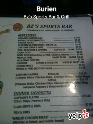 B Z S Sports Bar Grill Menu In Burien Washington Usa